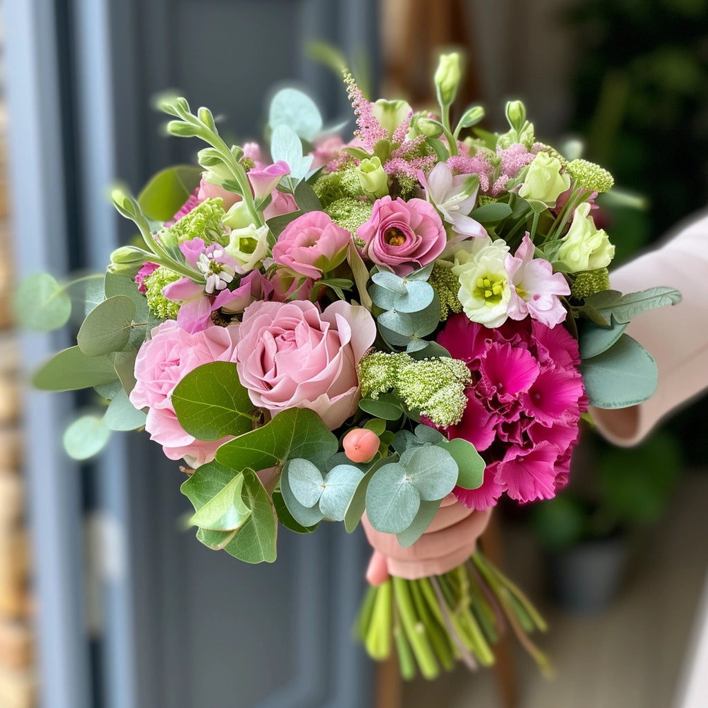 Fleurs principales : Pivoine, Germini, Lisianthus, Oeillet, Eucalyptus.